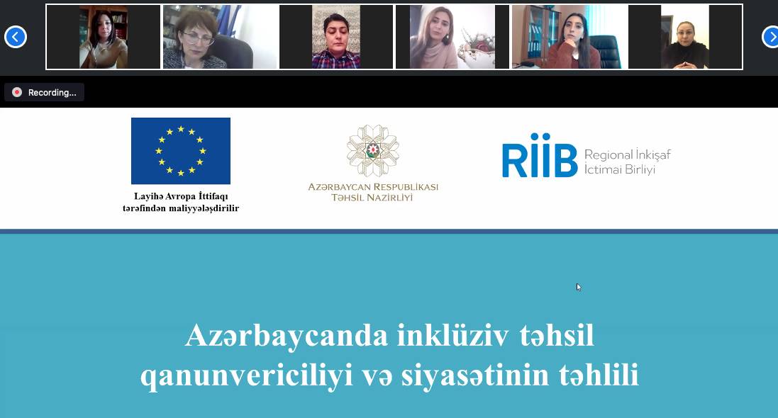 Avropa İttifaqının maliyyə dəstəyi ilə "Regional İnkişaf" İctimai Birliyi tərəfindən həyata keçirilən "Müəllimlərin inklüziv təhsil sahəsində bacarıqlarının artırılması" layihəsi çərçivəsində Azərbaycanda mövcud inklüziv təhsil qanunvericiliyi və siyasətinin təhlili mövzusunda onlayn görüş təşkil olunub.
