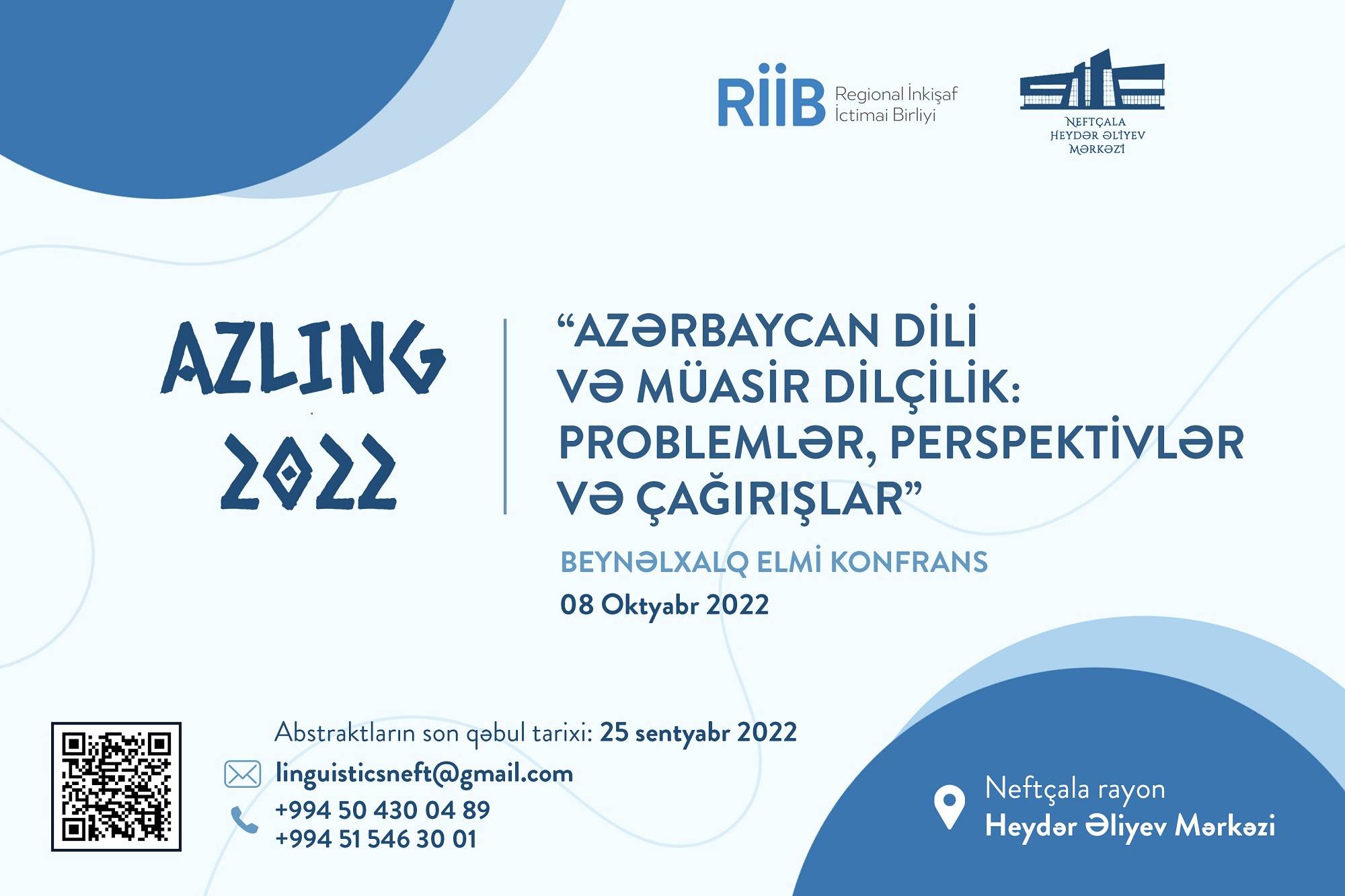 "Regional İnkişaf" İctimai Birliyi (RİİB) və Neftçala rayon Heydər Əliyev Mərkəzinin birgə təşkilatçılığı ilə oktyabrın 8-də “AZLİNG 2022-Azərbaycan dili və müasir dilçilik: problemlər, perspektivlər və çağırışlar” mövzusunda beynəlxalq elmi konfrans keçiriləcək.